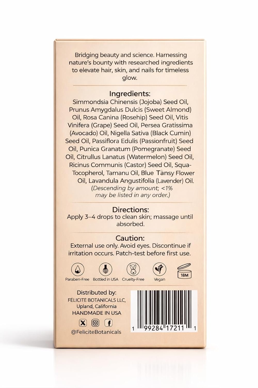 Illuminate your skin and strengthen your nails with Radiance, a botanical blend designed to enhance your natural glow. At its core, Grapeseed Oil provides a lightweight, fast-absorbing feel, while Golden Jojoba, Avocado, and Sweet Almond oils hydrate, soften, and restore balance. Rich in antioxidants from Rosehip, Pomegranate Seed, and Passionfruit oils, along with Vitamin E and Squalane, this formula helps protect against environmental stressors and supports a smooth, radiant complexion. Black Cumin Seed Oil helps soothe irritation and promotes a balanced appearance. Crafted for daily use, Radiance absorbs effortlessly, leaving behind a refined, healthy glow—never greasy, always luminous.